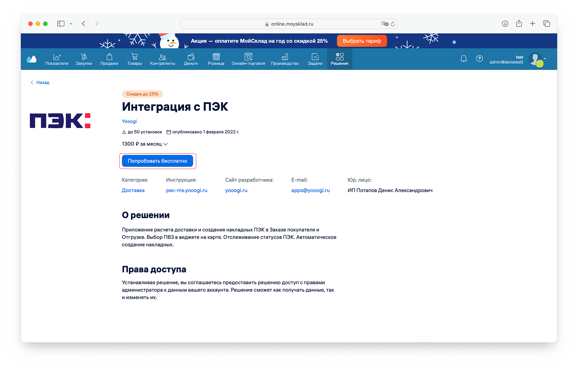 В открывшемся каталоге перейдите в карточку "Интеграция с ПЭК" (Yooogi)